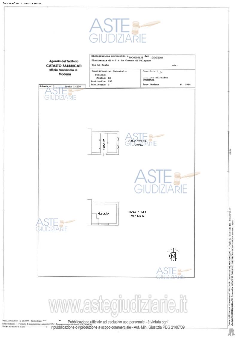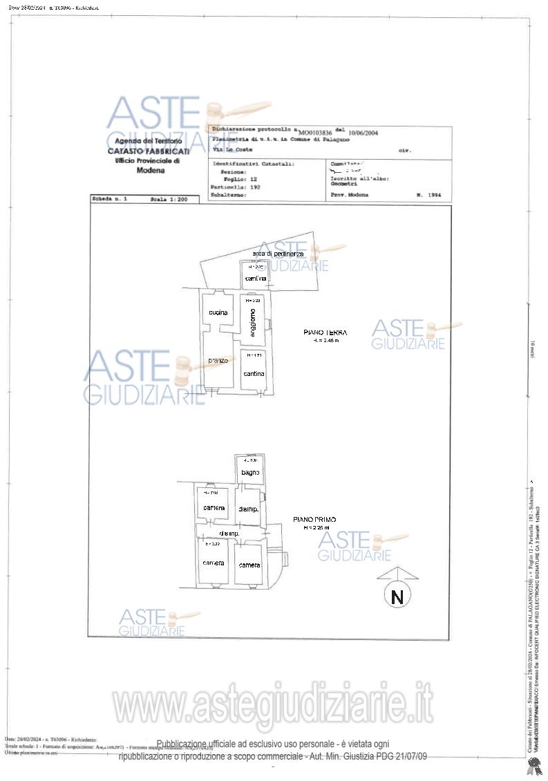 Vendita all'asta Senza incanto, con gara telematica asincrona - LOTTO UNICO: Piena proprietà immobili in Palagano-Frazione Monchio,Via Le Coste Snc,costituiti da:-abitazione con area pertinenza esclusiva,composta al PT da cucina collegata alla zona pranzo,soggiorno;2cantine.Il P.1,accessibile da scala esterna,è composto da3camere da letto,disimpegno e servizio igienico;-deposito, con piccola area cortiliva attigua accatastata BCNC;-terreno(Seminativo);identificati al C.F.al foglio12,mappale192(A/7),mappale195, sub3(C/2)e sub1(BCNC)e al C.T.al foglio12,mappali186(Seminativo)e192(EU). Prezzo base € 14.765,63 (offerta minima € 11.074,22). Data inizio operazioni di vendita: 16/04/2026 ore 15:00. Professionista delegato alla vendita Avv. Annalaura Panichi - Email "annalaurapanichi@giustiassociati.it"; Tel. 059222115. Custode Giudiziario Alex Manelli - Email "visiteimmobili@ivgmodena.it"; Tel. 059847301. Rif. Tribunale di Modena - Esecuzione immobiliare post legge 80 n. 22/2023