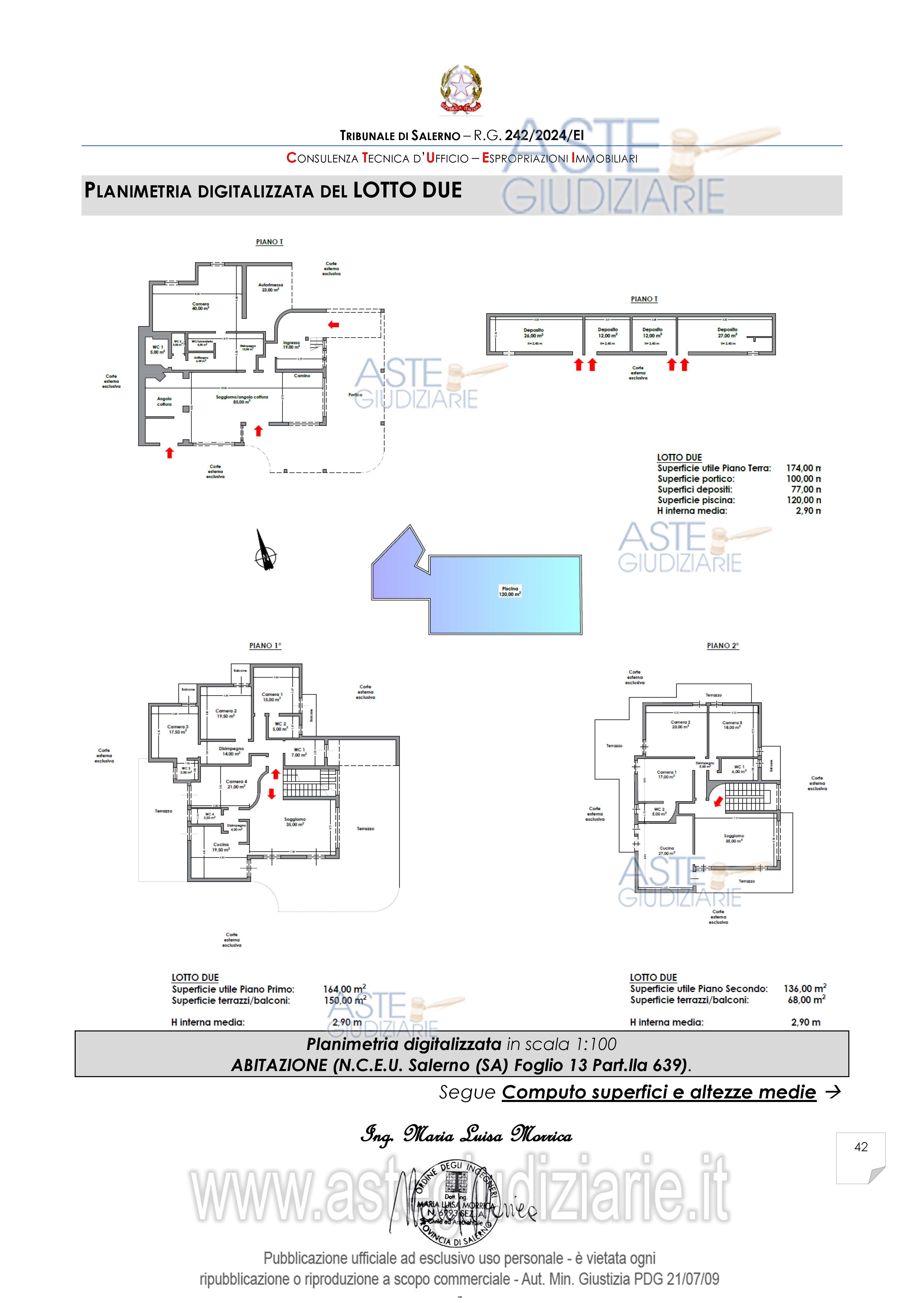 Vendita all'asta Senza incanto, con gara telematica asincrona - LOTTO 2: Villino indipendente, dislocato su tre livelli fuori terra, con giardino, corte, area svago e forno, piscina e pertinenze esterne. Prezzo base € 597.780,00 (offerta minima € 448.335,00). Data inizio operazioni di vendita: 06/05/2026 ore 12:00. Professionista delegato alla vendita Avv. Marcella Indinnimeo. Custode Giudiziario Avv. Marcella Indinnimeo - Email "avvmarcellaindi@gmail.com". Rif. Tribunale di Salerno - Espropriazione immobiliare (cartabia) n. 242/2024