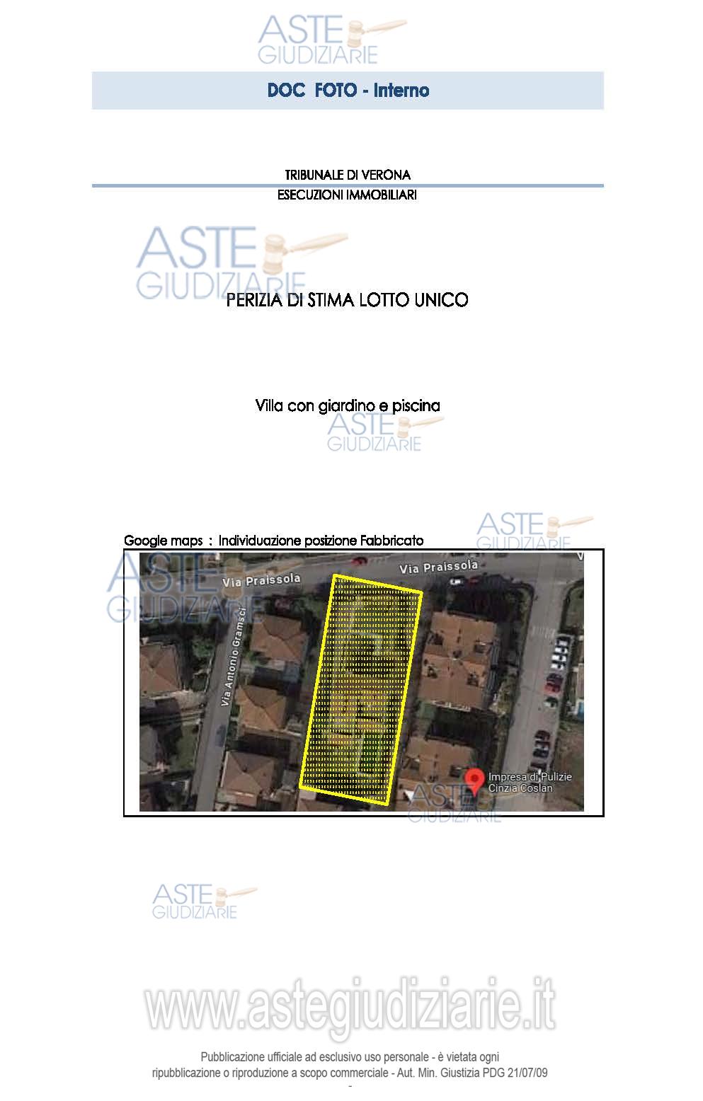 Vendita all'asta Senza incanto, con gara telematica sincrona mista - LOTTO UNICO: Abitazione in villini sviluppata su due piani fuori terra e un piano interrato con giardino, piscina e garage oltre a n. 2 aree urbane pertinenziali. Prezzo base € 337.500,00 (offerta minima € 253.125,00). Data vendita 11/11/2025 ore 11:00. Professionista delegato alla vendita Avv. Stefano Rossi - Email "stefano.rossi@studiodalfini.it"; Tel. 045590548. Custode Giudiziario Avv. Lorenzo Dalla Rosa - Email "avv.dallarosa@fastwebnet.it"; Tel. 0458009450. Rif. Tribunale di Verona - Espropriazione immobiliare (cartabia) n. 362/2023