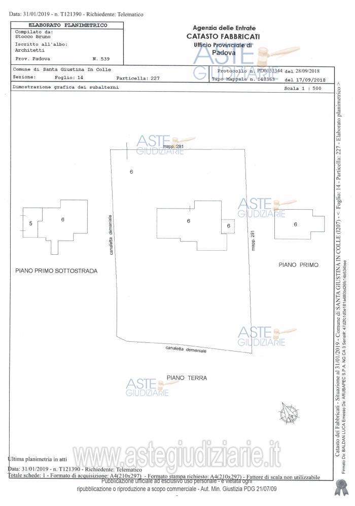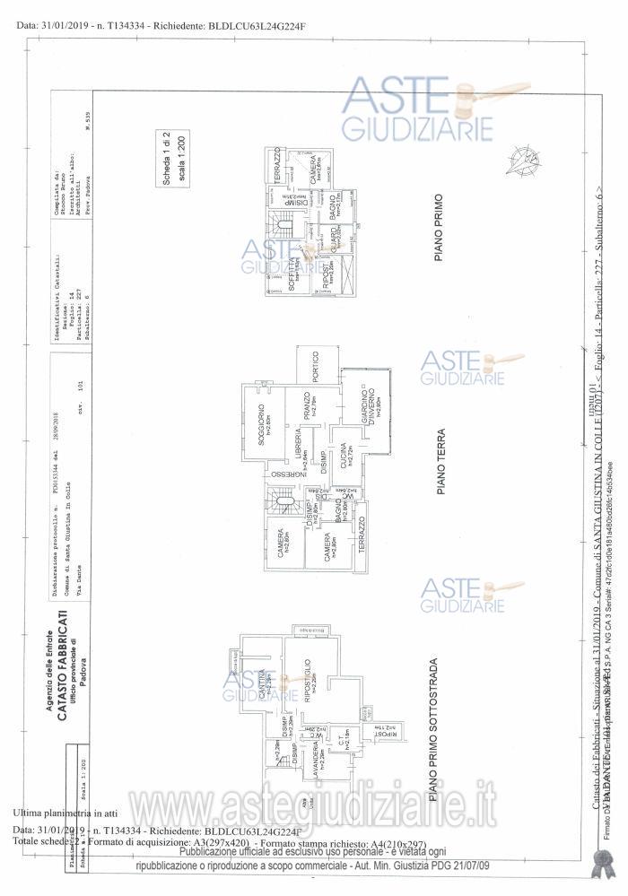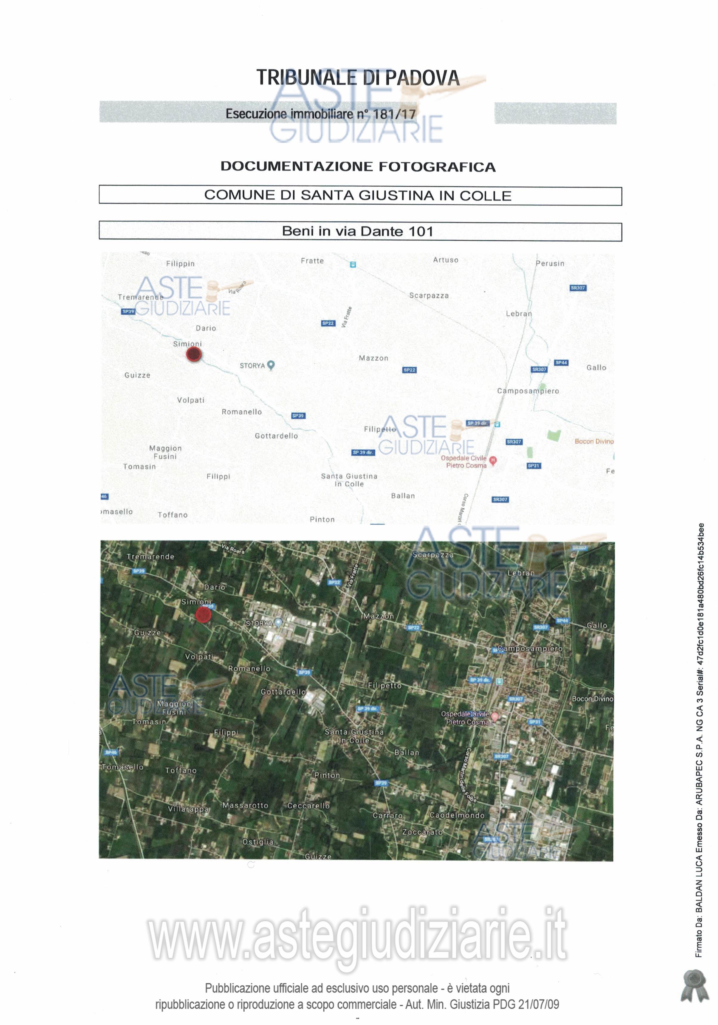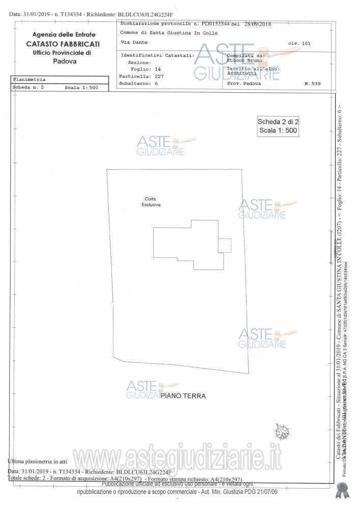 Vendita all'asta Senza incanto, con gara telematica sincrona - LOTTO 2: LOTTO DUE. Intera piena proprietà di singolo fabbricato residenziale, sito in Comune di Santa Giustina in Colle (PD), via Dante n. 101, con le sue pertinenze accessorie (giardino e garage); la consistenza complessiva residenziale è di commerciali 449,20 mq, ne conclude la consistenza lo scoperto esclusivo di circa 19.500 mq. Il fabbricato è composto da un piano seminterrato, da un piano terreno e da un piano primo (sottotetto), comunicanti tramite una scala interna. Occupato dalla parte esecutata. Prezzo base € 400.000,00 (offerta minima € 300.000,00). Data vendita 28/11/2025 ore 11:00. Professionista delegato alla vendita Avv. Ana Elisa Marti Garro - Email "martigarro.aste@gmail.com"; Tel. 0496892448. Custode Giudiziario Avv. Ana Elisa Marti Garro - Email "martigarro.aste@gmail.com"; Tel. 0496892448. Rif. Tribunale di Padova - Esecuzione immobiliare post legge 80 n. 181/2017