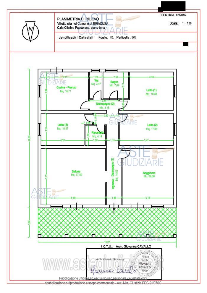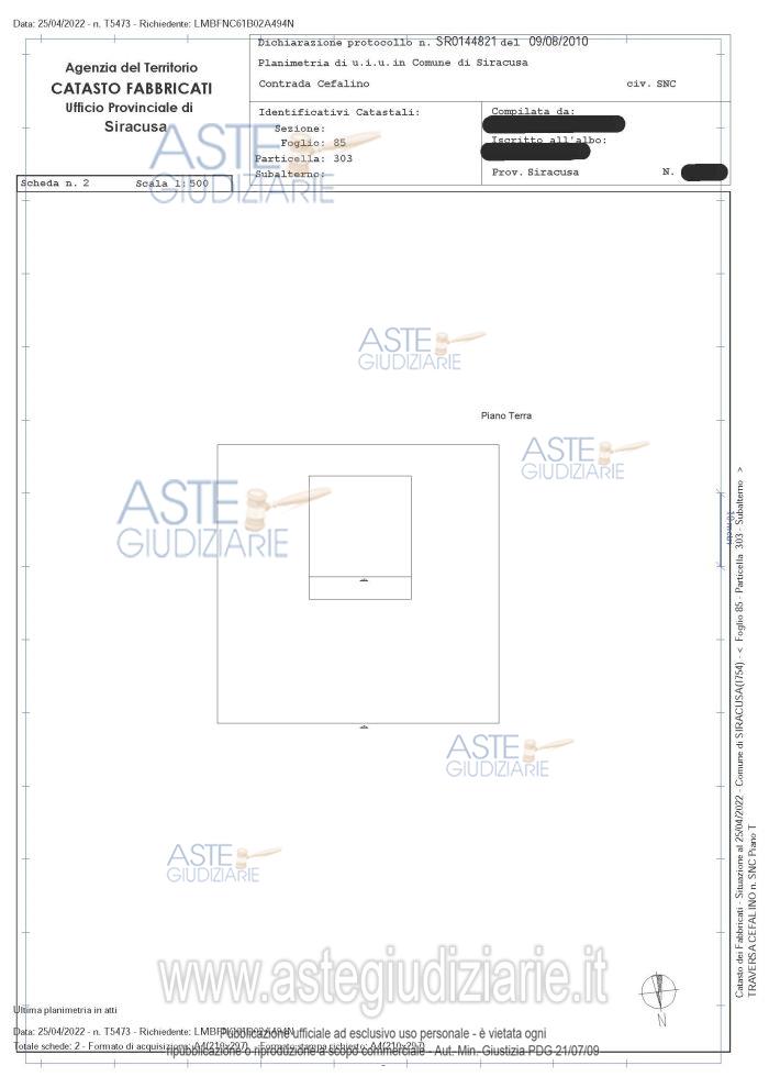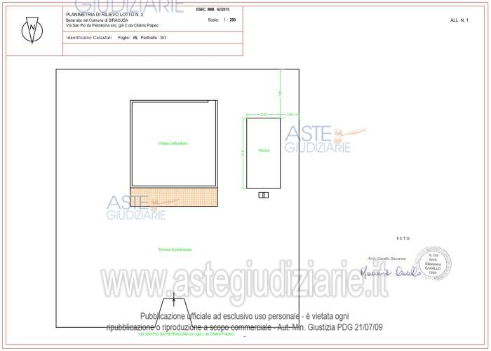 Vendita all'asta Senza incanto, con gara telematica sincrona mista - LOTTO 2:  Piena ed intera proprietà del villino unifamiliare, con annesso terreno di pertinenza di mq. 1619, in Siracusa, Contrada Cifalino-Papeo, via S. Pio da Petralcina s.n. (località Tivoli), in N.C.E.U. al foglio 85, p.lla 303, cat. A/7, cl. 3, vani 8, superficie catastale totale mq 222-totale escluse aree scoperte mq 192, R.C. € 1.053,57, Traversa Cefalino snc piano T, superficie utile mq. 169,90, superficie commerciale mq. 250,66, Classe Energetica “F”. Prezzo base € 87.662,54 (offerta minima € 65.746,90). Data vendita 11/12/2025 ore 11:00. Giudice Dott. Maria Cristina Di Stazio. Professionista delegato alla vendita Avv. Paolo Munafò - Email "avv.paolomunafo@mbcg.it"; Cell. 3387429274; Tel. 09311562510. Custode Giudiziario Avv. Paolo Munafò - Email "avv.paolomunafo@mbcg.it"; Cell. 3387429274; Tel. 09311562510.  Rif. Tribunale di Siracusa - Esecuzione immobiliare post legge 80 n. 62/2015