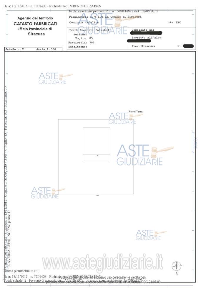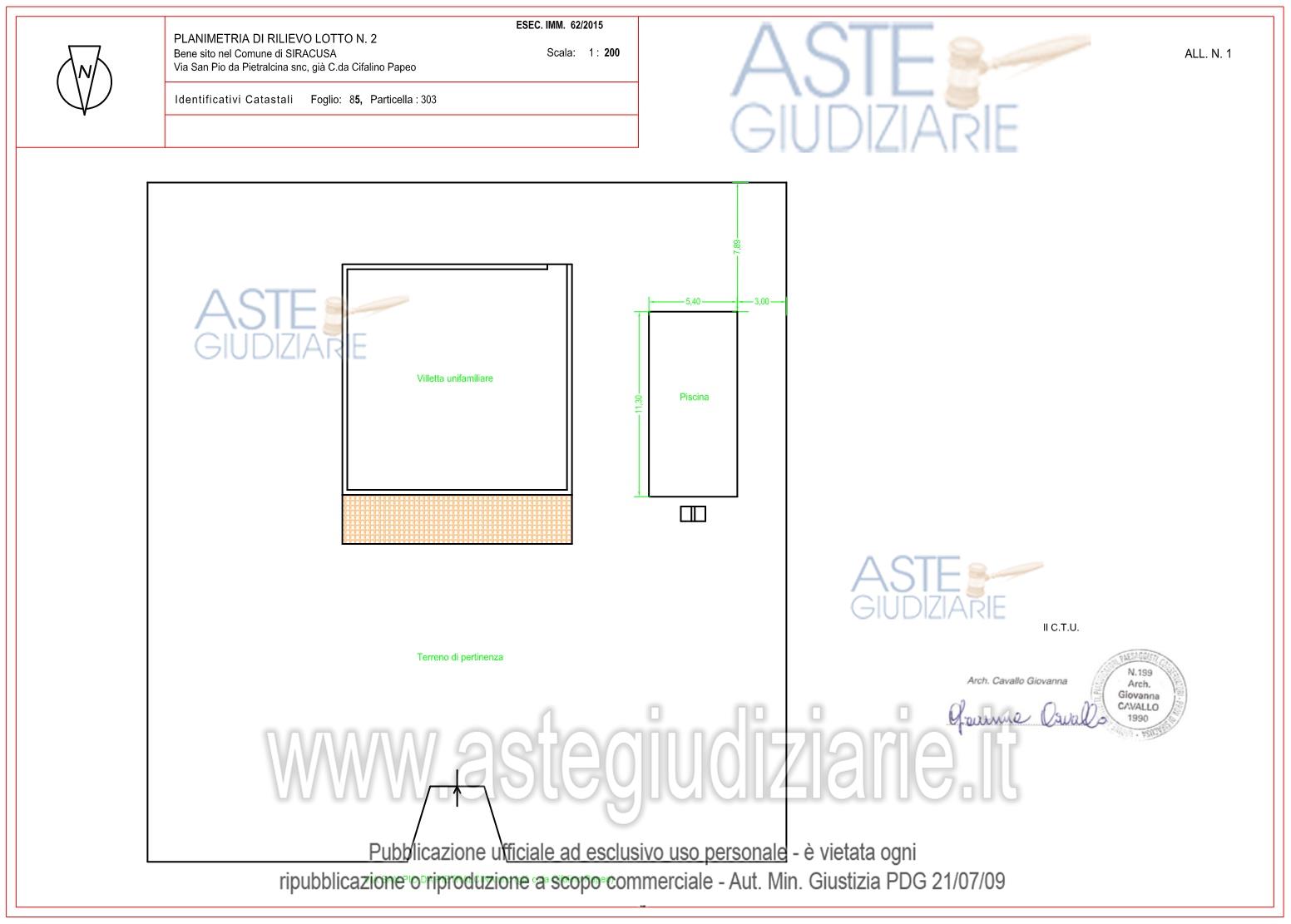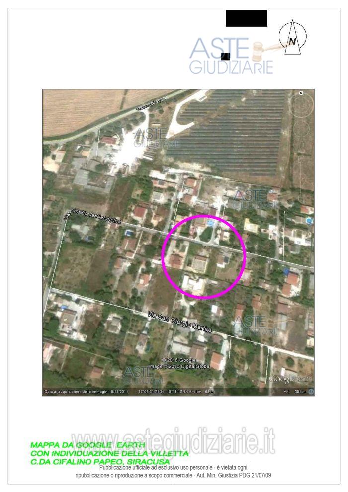 Vendita in attesa dell'emissione del nuovo bando d'asta. LOTTO 2: Piena ed intera proprietà del villino unifamiliare, con annesso terreno di pertinenza di mq. 1619, in Siracusa, Contrada Cifalino-Papeo, via S. Pio da Petralcina s.n. (località Tivoli), in N.C.E.U. al foglio 85, p.lla 303, cat. A/7, cl. 3, vani 8, superficie catastale totale mq 222-totale escluse aree scoperte mq 192, R.C. € 1.053,57, Traversa Cefalino snc piano T, superficie utile mq. 169,90, superficie commerciale mq. 250,66, Classe Energetica “F”. Ultimo prezzo base € 87.662,54 (offerta minima € 65.746,90). Giudice Dott. Maria Cristina Di Stazio. Professionista delegato alla vendita Avv. Paolo Munafò - Email "avv.paolomunafo@mbcg.it"; Cell. 3387429274; Tel. 09311562510. Custode Giudiziario Avv. Paolo Munafò - Email "avv.paolomunafo@mbcg.it"; Cell. 3387429274; Tel. 09311562510. Rif. Tribunale di Siracusa - Esecuzione immobiliare post legge 80 n. 62/2015