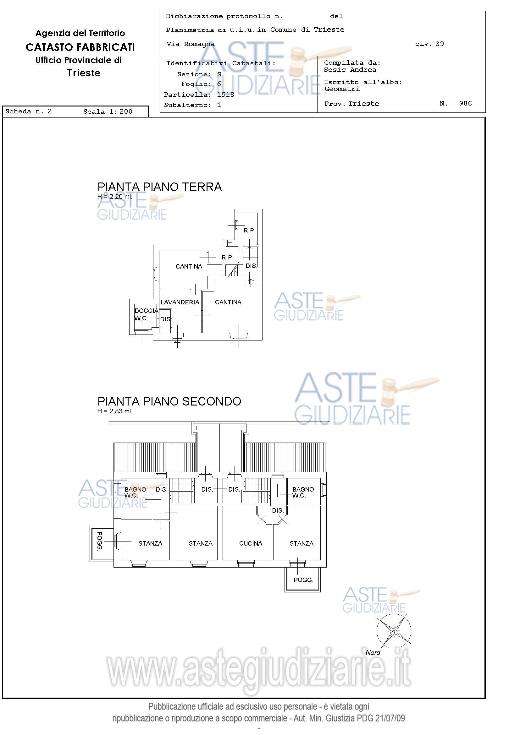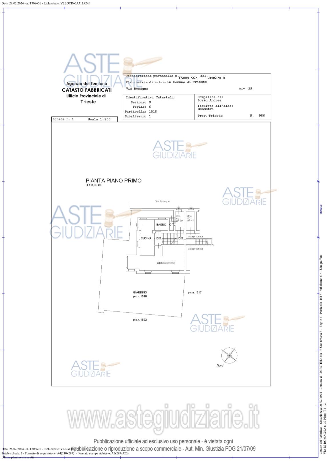 Vendita all'asta Senza incanto, con gara telematica sincrona mista - LOTTO UNICO: ALLOGGIO IN VILLINO BIFAMILIARE CON BOX AUTO, POSTO MACCHINA SCOPERTO E CON GIARDINO DI PROPRIETA' ESCLUSIVA. IL PIANO TERRA E' COMPOSTO DA 2 CANTINE, VANO LAVANDERIA, DOCCIA-WC E 2 RIPOSTIGLI CON DISIMPEGNI. IL PRIMO PIANO E' COMPOSTO DA ATRIO DI INGRESSO, DISIMPEGNO CON SCALE, CUCINA ABITABILE, BAGNO-W.C., SOGGIORNO/SALETTA DA PRANSO E VANO CALDAIA. IL SECONDO PIANO E' COMPOSTO DA 4 STANZE, 2 BAGNI-W.C. NONCHE' DUE POGGIOLI E UNA VERANDA PARZIALMENTE COSTRUTITA SOPRA L'INGRESSO. SUP. CATASTALE 306MQ. Prezzo base € 390.000,00 (offerta minima € 300.000,00). Data vendita 12/11/2025 ore 12:00. Rif. Tribunale di Trieste - Volontaria giurisdizione n. 4452/2021